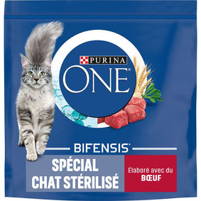 Nous donnons exclusivement des croquettes chats stérilisés de la marque Purina One.